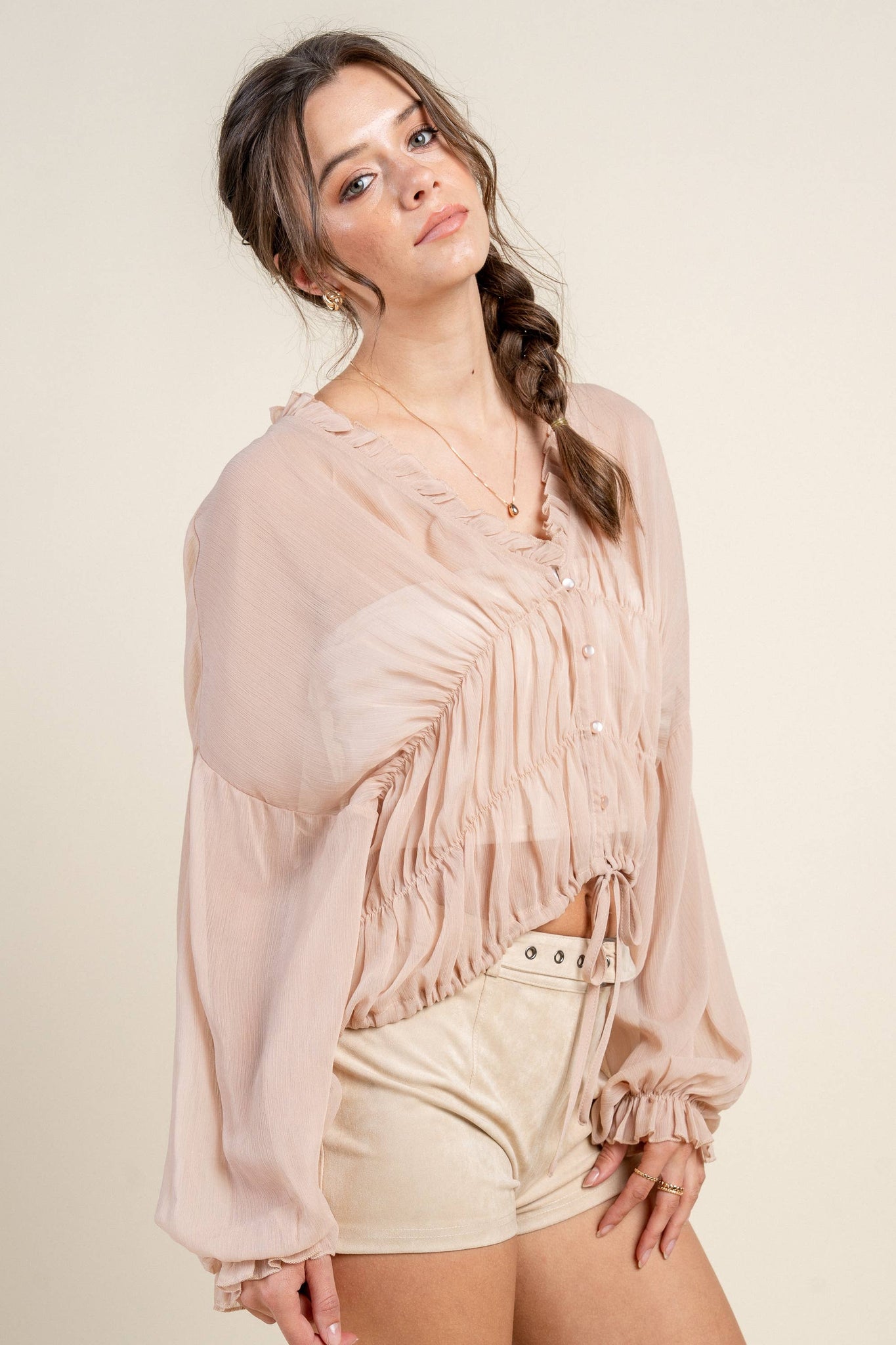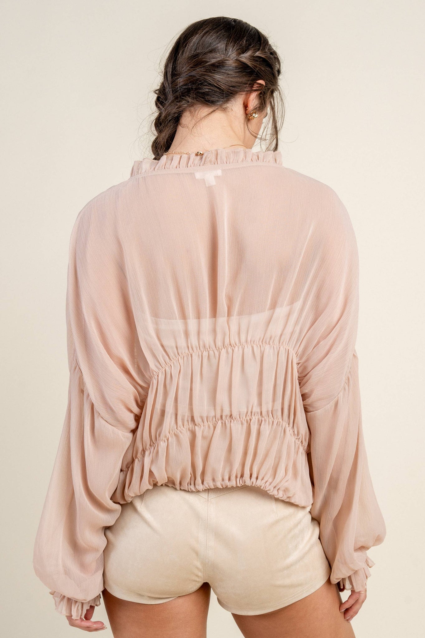 CREPE CHIFFON LONG SLEEVE TOP SELF:100%POLYESTER |  MODEL IS 5'8" AND IS WEARING A SMALL