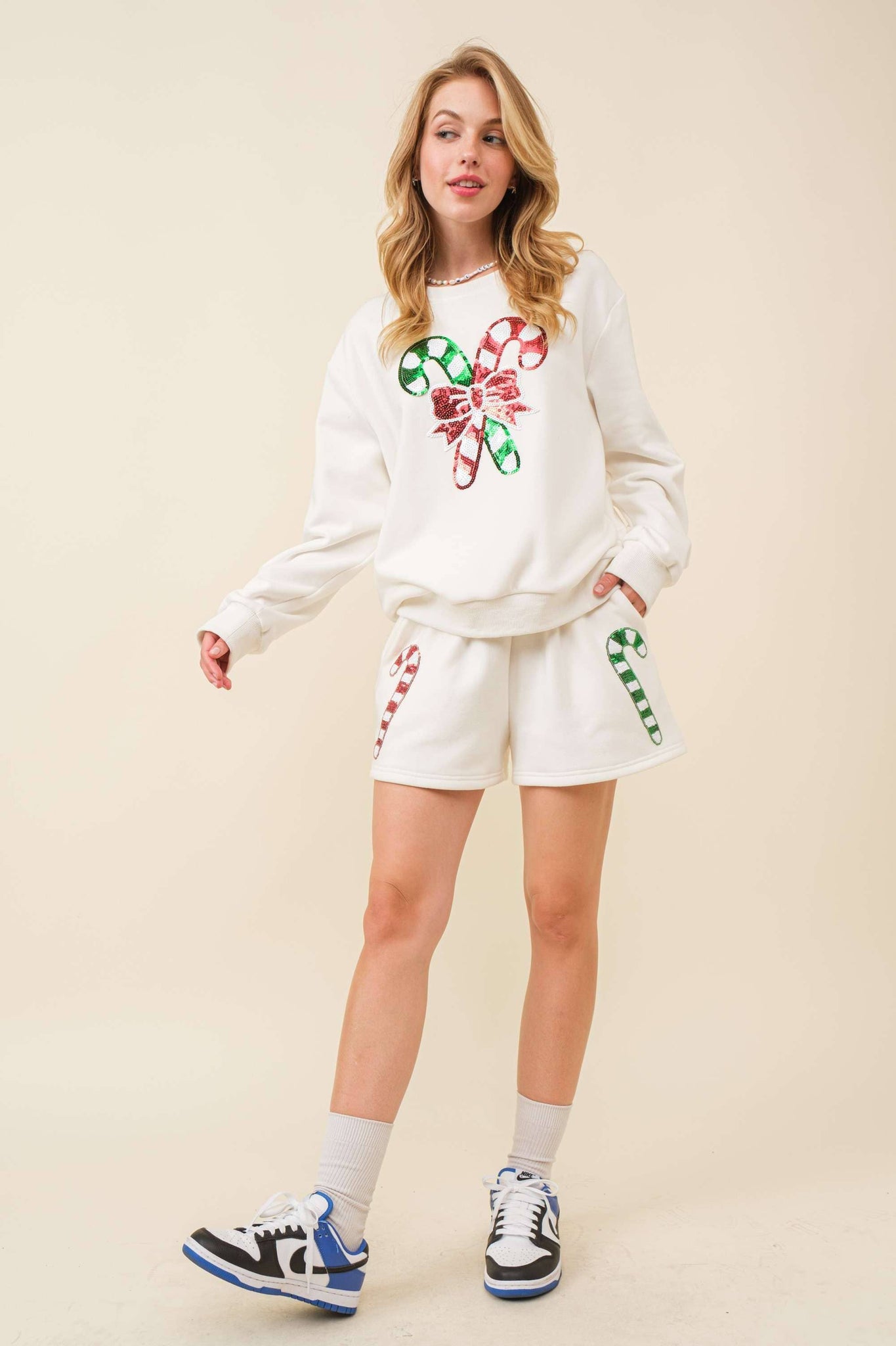 Sequin Christmas Candy Cane Patch Fleece Shorts MATCHING SET