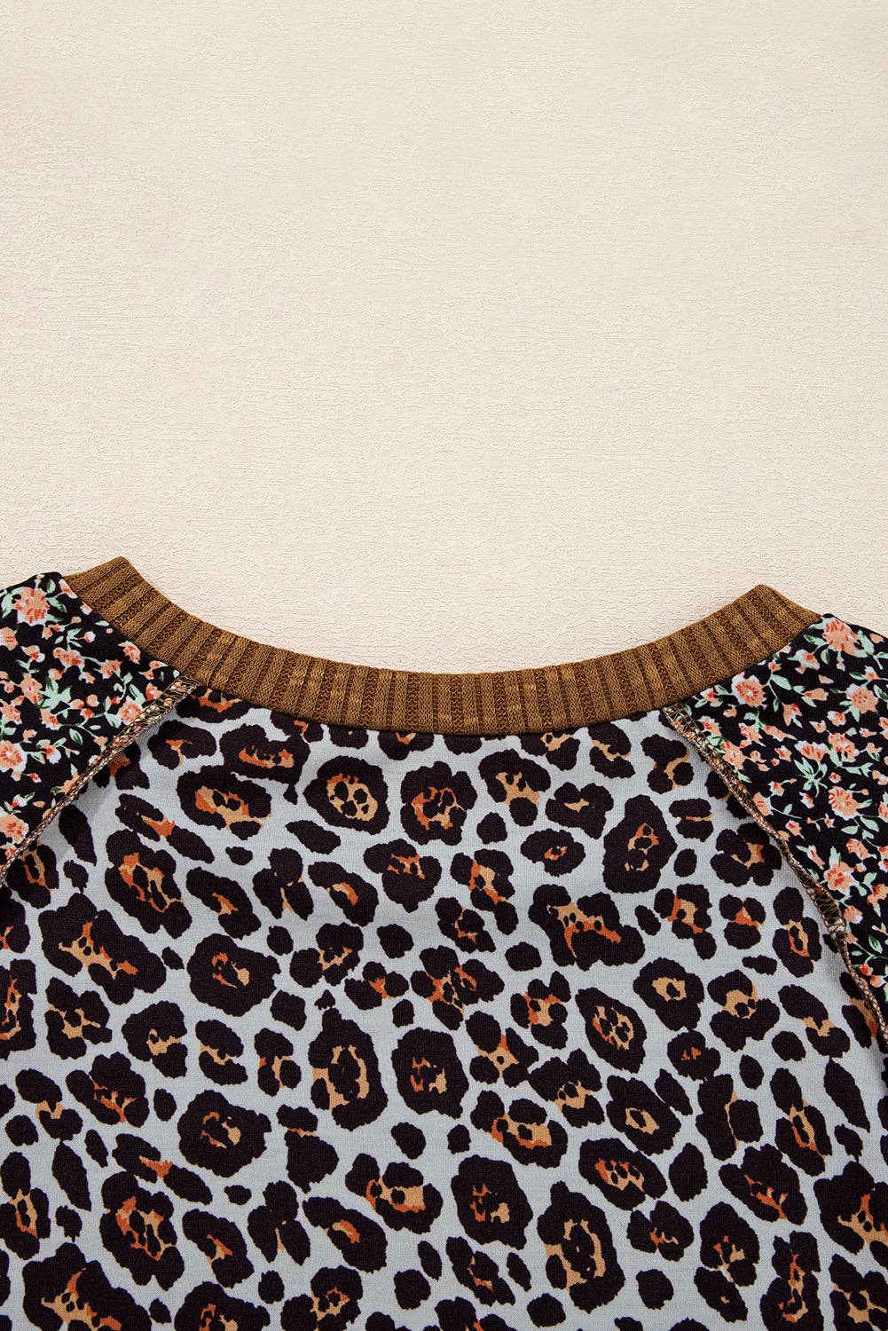 Leopard Floral Ribbed Patchwork Pullover: Brown / L