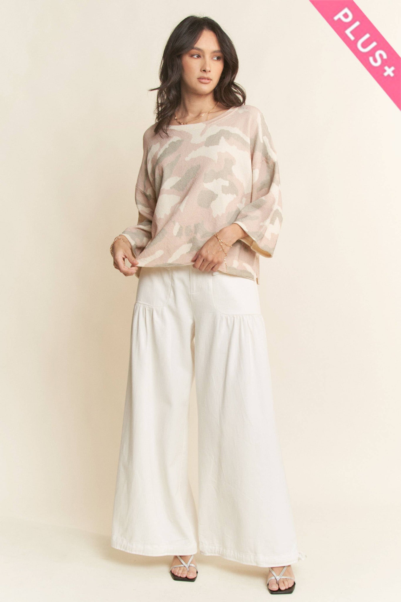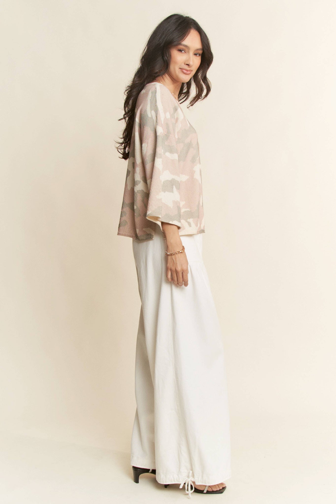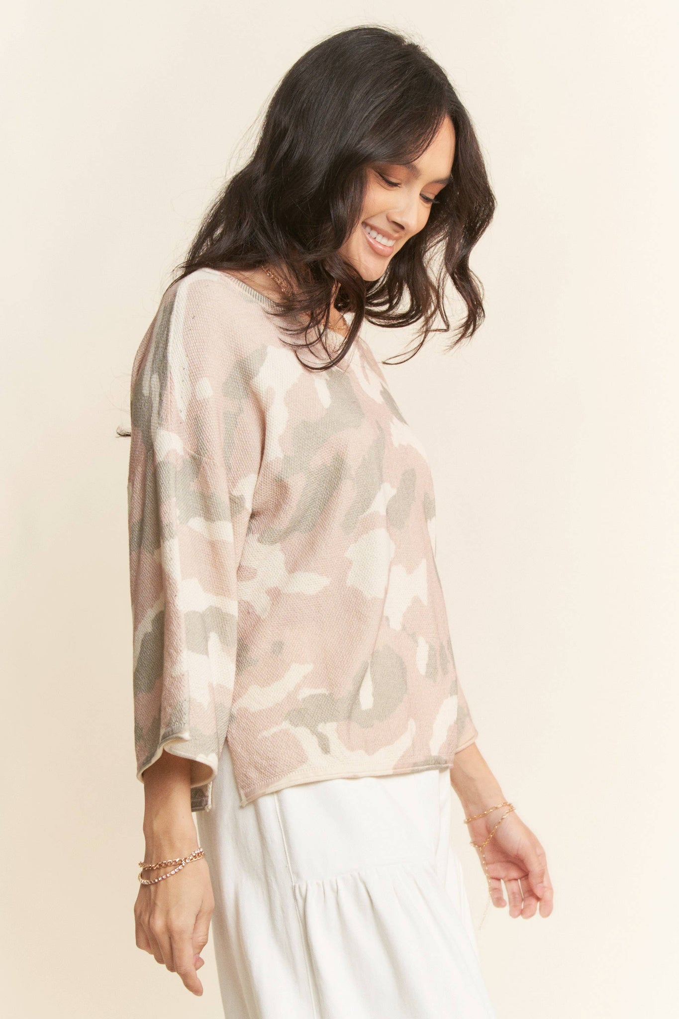 Loose fit knit top with military camo design and long sleeves, crafted for comfort and easy layering. Its relaxed silhouette pairs effortlessly with denim or wide leg pants, offering boutique buyers a versatile style that blends unique detail with refined casual appeal for year-round wear.
